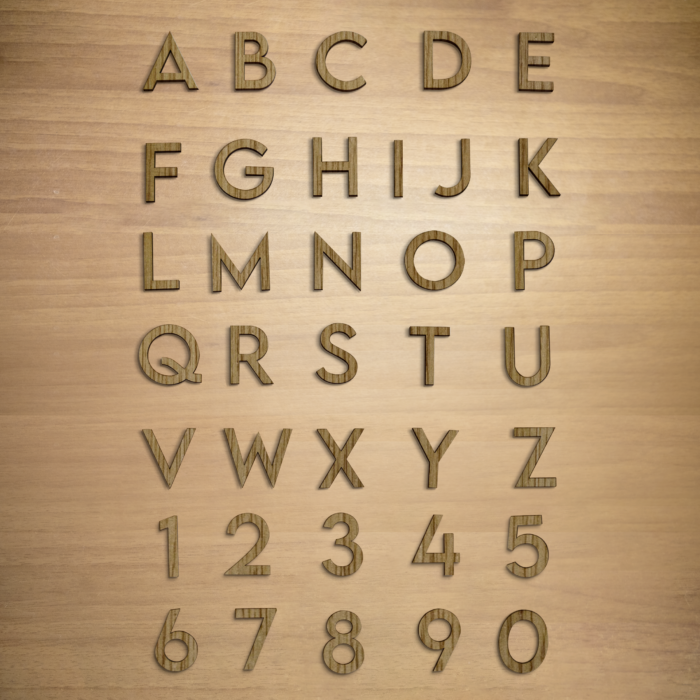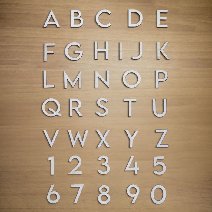 Lettere e numeri in betulla, pioppo o rovere, dallo spessore di 4mm.